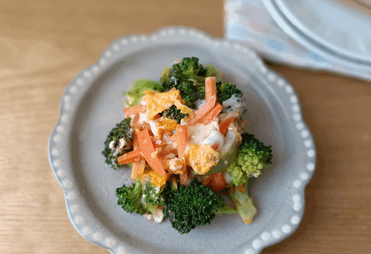 材料(1~2人分) ブロッコリー1/2株(約100g)人参1/3本(40~50g)卵1個塩麹大さじ1/2ケチャップ大さじ1/2 作り方 ①人参を細切りに、ブロッコリーを小さめにカット ②耐熱ボウルか深めの皿にブロッコリーの茎を下向きに、人参と調味料を入れラップをしてレ...
